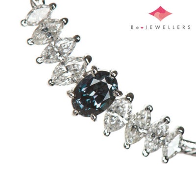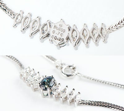 変色効果の鮮やかなブラジル産アレキサンドライト0.78ctをセットしたネックレス。昼光下で緑青色、白熱光下では赤紫色と鮮やかなカラーチェンジを楽しむことができます。装飾のマーキスブリリアントダイヤモンドは、メインストーンの美しさを引きたてるシンプルなデザイン。産出量の少ない人気のアレキサンドライトを使ったエレガントなジュエリーです。