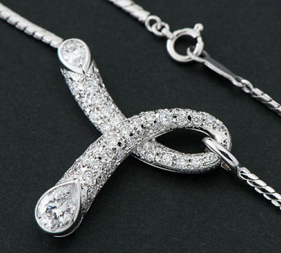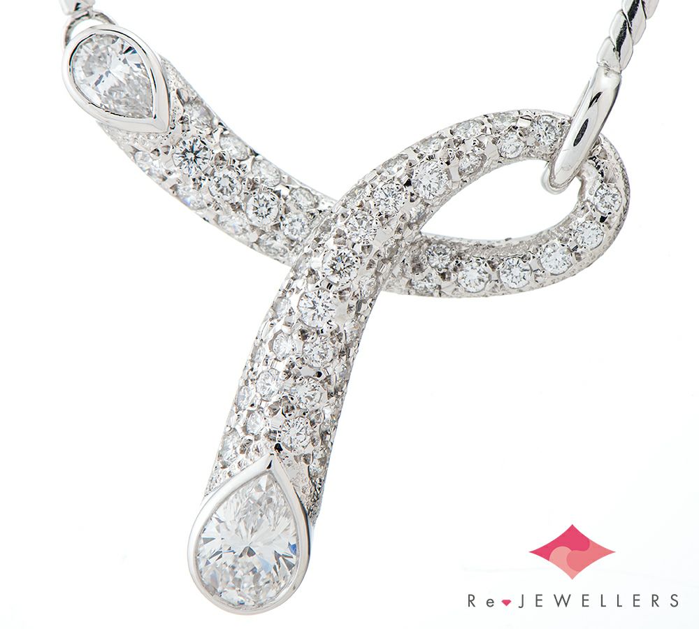 真珠だけでなく、日本におけるダイヤモンドの歴史を築き上げたことでも有名なミキモト。透明感のある煌めきと存在感のあるサイズが目を引く、0.53ctのペアブリリアントダイヤモンドをセットした個性的なペンダント・ネックレスです。立体感のある曲線に、滑らかにパヴェセッティングされたダイヤモンドが一体感のある輝きを放ちます。もう一方の端にもペアブリリアントダイヤモンドをセットした贅沢なデザイン。しなやかなスネークチェーンを合わせたラグジュアリーなジュエリーです。