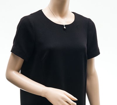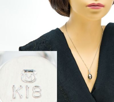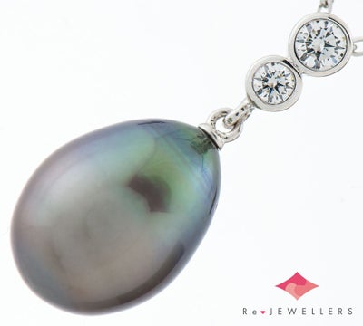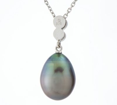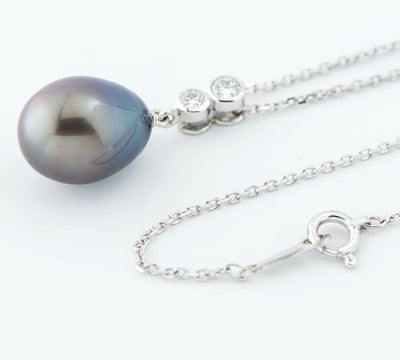 幻想的な干渉色が目を引くドロップシェイプの黒蝶真珠ペンダント・ネックレス。装飾は、ベゼルセッティングのダイヤモンド二石が連なるシンプルなデザインです。デイリーから特別な場面まで、シーンを問わず楽しむことのできる使い勝手の良いジュエリーです。