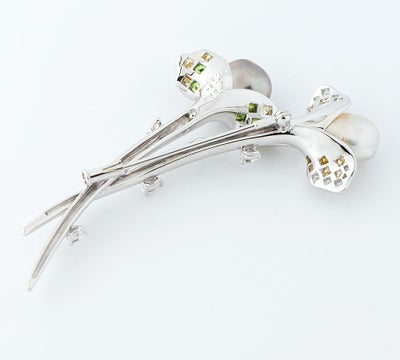 ミキモト フラワーモチーフ バロック パール(真珠) デマントイドガーネット 計0.34ct ダイヤモンド 計1.33ct 18金ホワイトゴールド ブローチ【中古】(2200000480507)