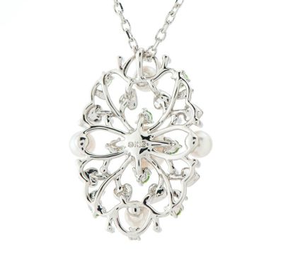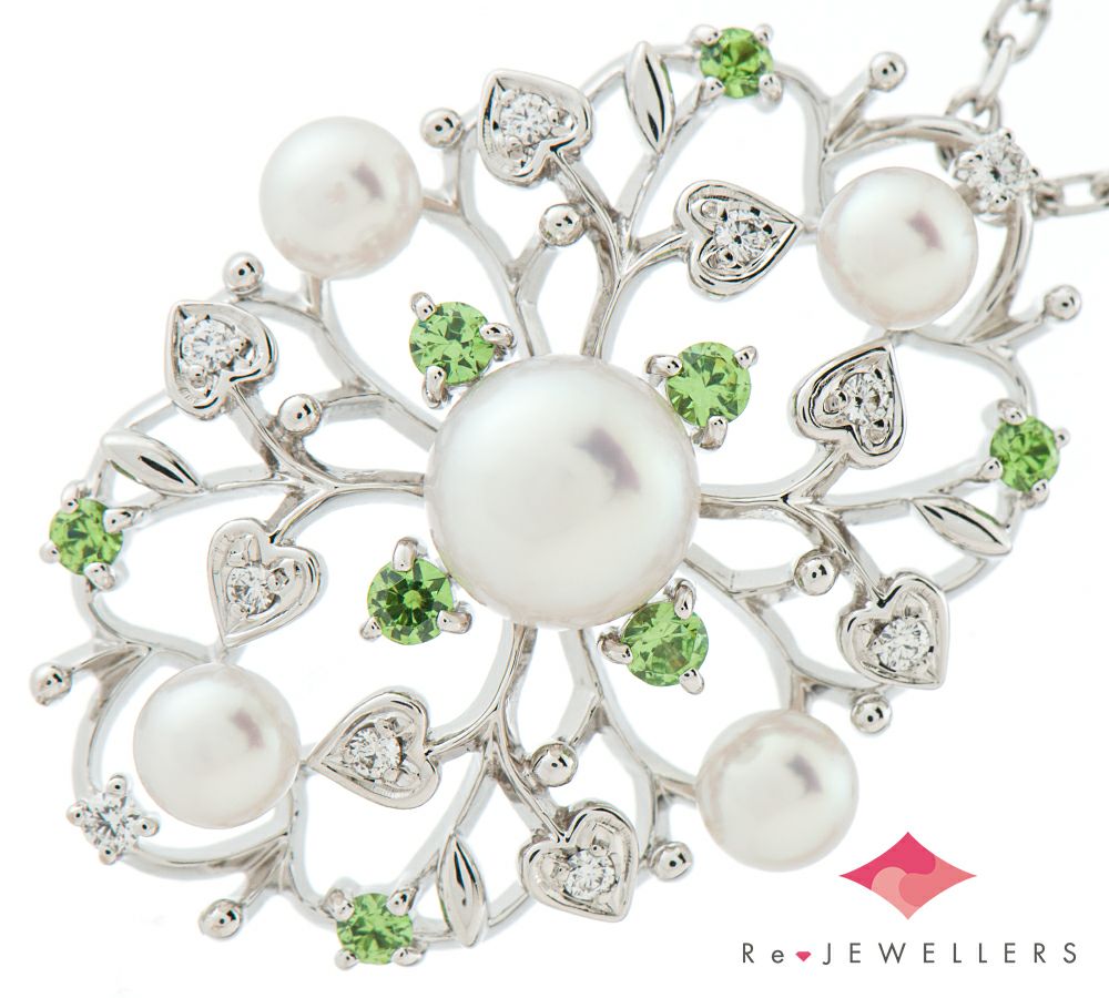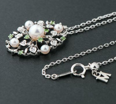 ボタニカルモチーフのように優雅な曲線デザインに、厳選したテリの良いアコヤ真珠をセットしたミキモトのペンダント・ネックレス。ハート型の枠にセットされたダイヤモンドが、眩い煌めきを放ちます。鮮やかなグリーンカラーは、デザインのポイントに。気品を纏う上質ジュエリーです。