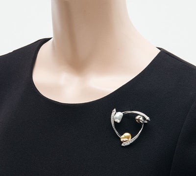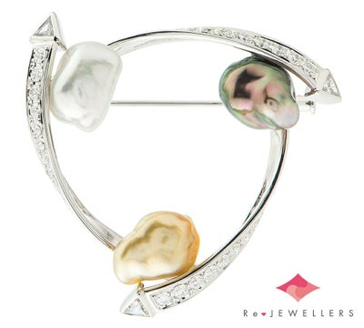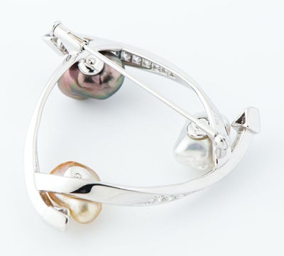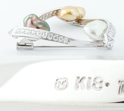 特徴 バロックパールの個性的な形状とブラック、ホワイト、ゴールドの3色に遊び心を感じるミキモトのブローチ。それぞれに現れる柔らかな干渉色と、シャープなダイヤモンドの輝きが目を引きます。選りすぐりのダイヤモンドは、先端部分にトリリアントカットダイヤモンドを3石セット。大振りで華やかなジュエリーです。