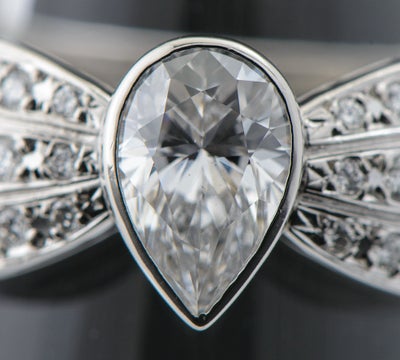 特徴 真珠だけでなく、日本におけるダイヤモンドの歴史を築き上げたことでも有名なミキモト。1.17ctの上質なペアブリリアントカットダイヤモンドを贅沢にあしらったプラチナリングです。リボンのように広がるアームが優美な印象を与え、指先を華やかに演出します。存在感と気品を兼ね備えた、ボリューム感のあるデザインです。