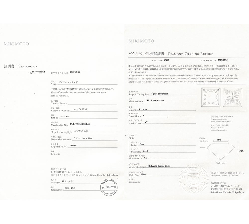 他の画像を見る ミキモト プリンセスカット ダイヤモンド1.01ct ダイヤモンド 計0.75ct プラチナ950 9号 リング・指輪【中古】(2200000489173) 価格 ¥ 1,000,000 税込 カートに入れる お気に入りに登録する