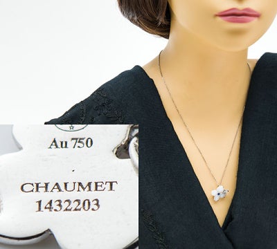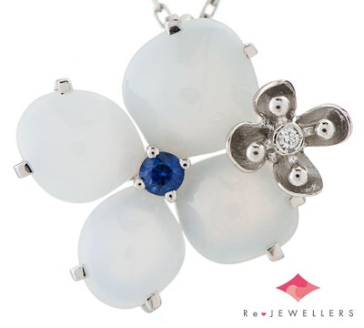 ショーメと縁の深いナポレオンの皇后ジョゼフィーヌが愛した庭園に植えられたことから、フランス語でアジサイを意味するオルタンシアをモチーフに作られたコレクション。艶やかなホワイトカルセドニーの中心に、ブルーサファイアをセットしたコントラストの美しいペンダント・ネックレスです。カルセドニーの柔らかな色合いが、可憐な雰囲気にマッチしてます。ホワイトゴールドの繊細な細工も見事なフェミニンなジュエリーです。