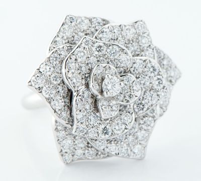 特徴 バラが持つ永遠の女性らしさを表現した人気のピアジェ ローズコレクション。美しくパヴェセッティングされたダイヤモンドの花びらが立体的に重なり、一体となって眩い煌めきを放ちます。非常に大振りで、インパクトのあるサイズに魅了されます。ふんだんに使用したダイヤモンドの重みがずっしりと伝わる、重厚感のあるラグジュアリーなジュエリーです。