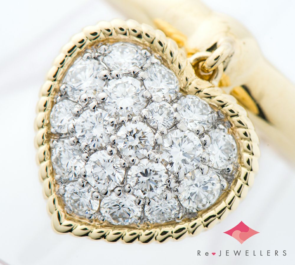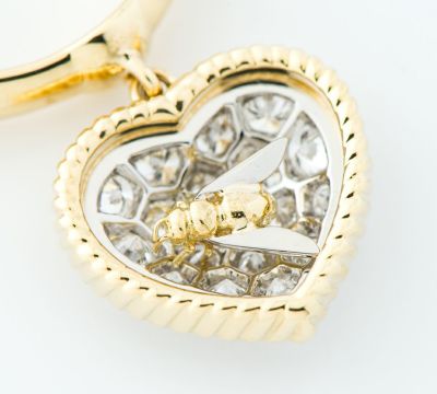 特徴 アジュール(裏取り)のハニカム(蜂の巣)細工の上に蜂が羽を休めている、ギメルの代表的なモチーフのリング。アーチを描くほどに滑らかにパヴェセッティングされたダイヤモンドが、一体感のある眩い煌めきを放ちます。金細工の装飾に縁どられたハートのパーツが、ゆらゆらと揺れる様が印象的。確かな技術が光る、洗練された上質ジュエリーです。