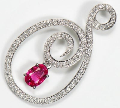 フランスの老舗ジュエラー、メレリオ・ディ・メレー(MELLERIO dits MELLER) のペンダントトップです。優雅な曲線を描くホワイトダイヤモンドの中心に輝きの良い非加熱ルビーをセット。エレガントなラグジュアリージュレリーです。
