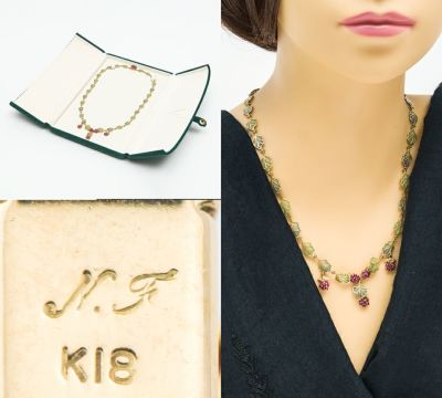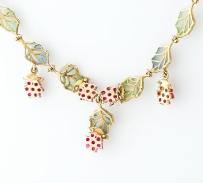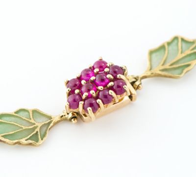 特徴 日本におけるエマイユ(七宝)ジュエリーの第一人者として高い評価を受けている、中嶋邦夫 ニックスファクトリー in The Garden/インザガーデンのネックレスです。山ぶどうの実をカボションルビー計2.77ctで表現、葉の部分を青と緑のプリカジュール・エナメルで表現されています。自然を巧妙に表現し、誰が見ても素直に美しいと感じられる完成度の高いフォルム、何世代にも渡って受け継がれるべき繊細で優美なジュエリーです。