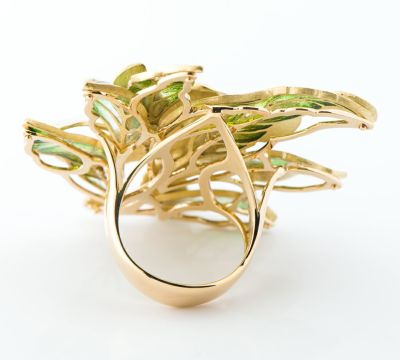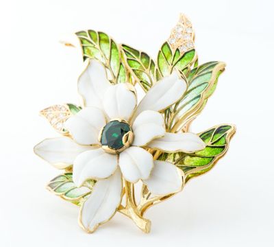 エマイユ技法を用いて独特の世界観を魅せる中嶋邦夫のニックスファクトリー。形容し難いほど圧倒的な美しさを放つ、華やかなフラワーモチーフのリングです。マットな白い花びらはたおやかに。鮮やかなグリーンのグラデーションが美しい葉は生き生きと瑞々しく、そして伸びやかに。繊細なゴールドのラインと、煌びやかなダイヤモンド、中央にセットされた深いグリーンのツァボライト1.60ctの凛とした佇まいが一体となって一つの作品を作り上げています。身に着ける芸術品と思える程。これほど大振りなつくりですが、装着時の違和感を感じさせないデザインのバランスは見事です。後世に大切に受け継いでいきたい、素晴らしいジュエリーです。