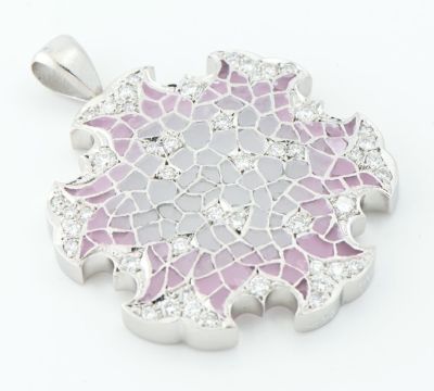 特徴 エマイユ技法を用いて独特の世界観を魅せる中嶋邦夫。数々の作品の中でも異彩を放つ、抽象的でモダンなデザインのペンダントトップです。モザイク模様は美しいピンクから始まり、中央に向かうにつれ向こう側がうっすら透けて見えるすりガラスのような透明感のあるエナメルが施されています。和のモチーフ、雪輪を美しく表現した芸術的なジュエリーです。
