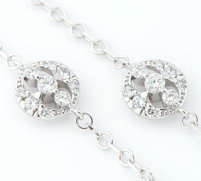 特徴 「原石に命を与える」というカッティングポリシーで知られる英国最古の宝飾ブランドMONNICKENDAM(モニッケンダム)。満ち欠けする月の表情を表現したムーンレイズ(Moon Rays) コレクションのステーション ネックレスです。計1.65ctの厳選されたダイヤモンドが、存在感のある眩い煌めきを放ちます。気品に満ちた華やかで重厚感のあるジュエリーです。