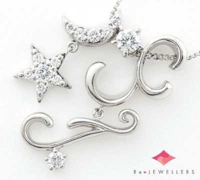特徴 国内・国外ともに数々の賞を受賞している日本を代表するジュエリーデザイナー・小寺智子。星&月をモチーフにした珍しくポップで可愛らしいペンダント ネックレスです。曲線を活かした軽やかでフェミニンなデザインと、ダイヤモンドそのものの素晴らしさは健在。アシンメトリーに配置したhappyのロゴに、独自の感性が光ります。眩いダイヤモンドの輝きが美しい、ロマンティックなジュエリーです。