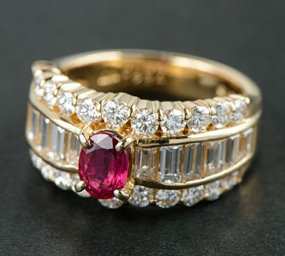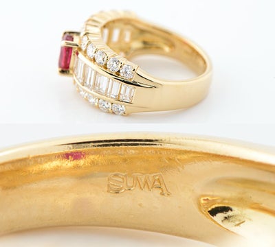 「受け継ぐ人に喜ばれること」というコンセプトで質の高いジュエリーを生み出しているSUWAのリング。眩いダイヤモンドの煌めきに圧倒されるルビーのリング。強い輝きを放つラウンドブリリアントカットダイヤモンドの間に、透明感のあるステップカットダイヤモンドが並びます。純粋な赤にこだわるSUWAが選びぬいた真紅のルビー。凛とした存在感を放つ上品なジュエリーです。