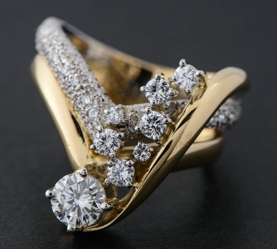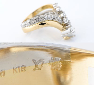 日本の美意識と品格が奥底に流れる独得の世界観で多彩なデザイン展開を見せる石川暢子。指元を美しく見せるV字デザインは、イエローゴールドとプラチナの組み合わせがラグジュアリーな印象を与えます。流れるように贅沢に散りばめられたダイヤモンドと個性的なプラチナのテクスチャーが相まって華やか。V字の先端にセットした上質な0.5ctアップのダイヤモンドが、眩い煌めきを放ちます。