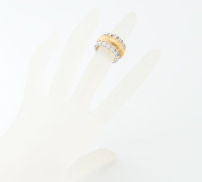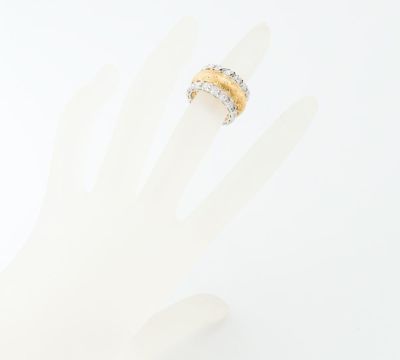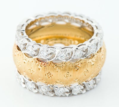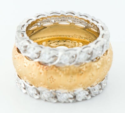 特徴 イタリア・ルネッサンスの伝統を受け継ぎながら独創的な作品で世界の人々を魅了し続けるジャンマリア・ブチェラッティ。卓越した技術を駆使して製作されたリングは、ヨーロッパのアンティークジュエリーのような気品と重厚感を感じさせます。イエローゴールド部分には、多数の細い線を平行に彫る技法リガートによって、織物の質感を思わせるシルクのような光沢が生まれます。そこに花の様な模様、端にも細やかな装飾が施されています。ダイヤモンドがセットされたホワイトゴールドの部分は、両サイドに葉のようなモチーフが途切れることなく続く緻密なデザイン。まさに唯一無二の存在感を放つクラシカルで上品なジュエリーです。