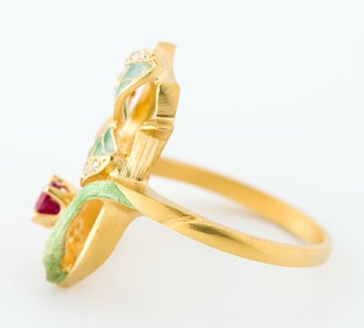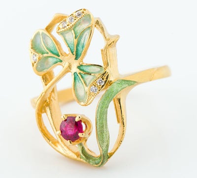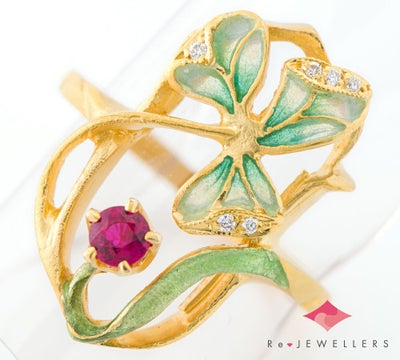 特徴 「バルセロナの至宝」と謳われるスペインのジュエリーブランド MASRIERA(マリエラ)のリングです。マリエラ社のジュエリーは、マリエラ七宝という半透明の七宝技術を用い、ほぼすべてハンドメイドで製作されています。優美な曲線を描く18金イエローゴールドに、緑や若草色を巧みに使い分け表現したエナメルの葉が映えます。深紅のルビーの煌めきが目を引くポイントに。軽やかで付け心地の良い芸術的なジュエリーです。