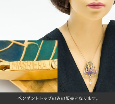 特徴 「バルセロナの至宝」と謳われるスペインのジュエリーブランド MASRIERA(マリエラ)のブローチです。マリエラ社のジュエリーは、マリエラ七宝という半透明の七宝技術を用い、ほぼすべてハンドメイドで製作されています。プリカジュールで表現したブルーの美しいグラデーションと立体的でマットな紫の花との奥行とコントラストが、作品としての存在感を与えています。優美な枠の曲線から、流れるように揺れるテリの良い淡水パール。芸術品としての一体感を感じる、絵画のように繊細なジュエリーです。