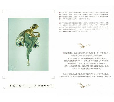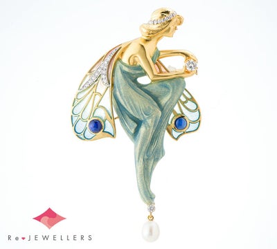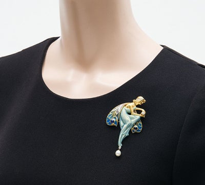 「バルセロナの至宝」と謳われるスペインのジュエリーブランド MASRIERA(マリエラ)のブローチです。マリエラ社のジュエリーは、マリエラ七宝という半透明の七宝技術を用い、ほぼすべてハンドメイドで製作されています。幻想的な妖精をモチーフにした女性像を立体的に表現したブローチです。見る者を魅了するプリカジュールの羽根は、ピンクからブルーへとグラデーションしており、ブルーサファイアやダイヤモンドを効果的に使ったデザインが見事。柔らかなドレープからわかる体のラインとマットな肌の質感が、絵画のように繊細で芸術的な表現を生み出します。手にはダイヤモンドを、足元には揺れるパールを。後世に受け継いでいきたい、唯一無二の感性が光る逸品です。