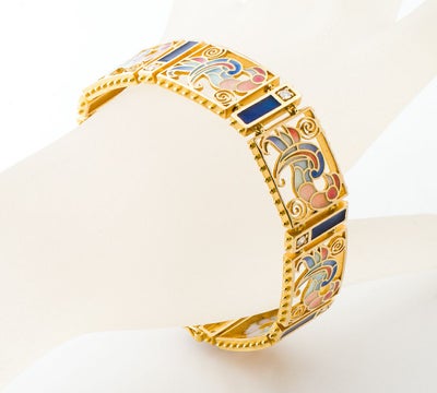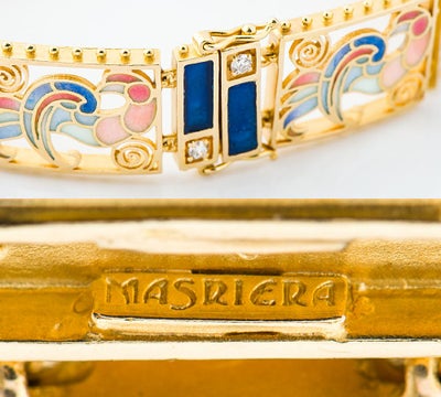 特徴 スペインのジュエリーブランドMASRIERA(マリエラ)社のブレスレットです。マリエラ社のジュエリーは、マリエラ七宝という半透明の七宝技術を用いて、ほぼすべてハンドメイドで製作され、その色使いと浮き彫り細工、アールヌーヴォーデザインが特徴です。 ステンドグラスのように光を通す装飾技法で淡い色づかいの繊細なグラデーションカラーが美しい鳳凰のようなモチーフと、濃紺のエナメルとダイヤモンド煌めくコントラストが美しいモチーフ、その魅力を存分にお楽しみ頂ける、とても希少なマリエラのジュエリーです。※取り外す際は、両サイドのストッパーを外しモチーフのダイヤモンド1P横にある突起を持ち上げると外れます。
