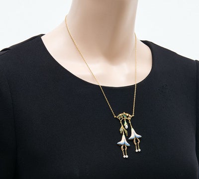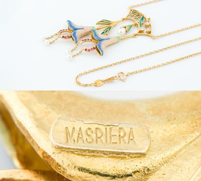 「バルセロナの至宝」と謳われるスペインのジュエリーブランド MASRIERA(マリエラ)のペンダント・ネックレスです。マリエラ社のジュエリーは、マリエラ七宝という半透明の七宝技術を用いて、ほぼすべてハンドメイドで製作され、その色使いと浮き彫り細工、アールヌーヴォーデザインが特徴です。 淡い色づかいの花弁に揺れるパールが美しい作品です。