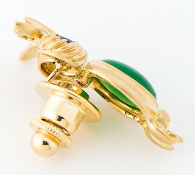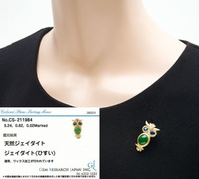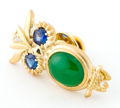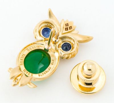 幸福のシンボル、フクロウをモチーフにしたブローチは翡翠のグリーン、サファイアのブルーとゴールドの枠の色合いがお互いを引き立てる見事な組み合わせ。大きな目が印象的な可愛らしいジュエリーです。
