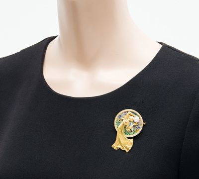 特徴 スペインのジュエリーブランドMASRIERA(マリエラ)社のブローチ。マリエラ社のジュエリーは、マリエラ七宝という半透明の七宝技術を用いて、ほぼすべてハンドメイドで製作され、その色使いと浮き彫り細工、アールヌーヴォーデザインが特徴。真円を思わせるほど完璧なフォルムのダイヤモンドの円に、様々な色や形のエナメル模様が施されています。18金イエローゴールドを用い、柔らかなドレープと服の繊細な柄を巧みに表現。ジュエリーという枠をこえ、芸術性に富んだ逸品です。