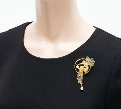 特徴 スペインのジュエリーブランドMASRIERA(マリエラ)社のブローチ。マリエラ社のジュエリーは、マリエラ七宝という半透明の七宝技術を用いて、ほぼすべてハンドメイドで製作され、その色使いと浮き彫り細工、アールヌーヴォーデザインが特徴。丸い円に腰かけた女神の構図は、まるで絵画作品のように一目で美しいと感じさせる気品溢れるデザインです。大事に抱えた一粒のパールへしなやかに伸びる長い腕、プリカジュールによる色彩豊かな透明感のあるエナメルの羽。ドレープが印象的な服には細かな模様があしらわれ、その先端にセットされたドロップシェイプのパールがゆらゆらと揺れています。ジュエリーという枠をこえ、芸術性に富んだ逸品です。