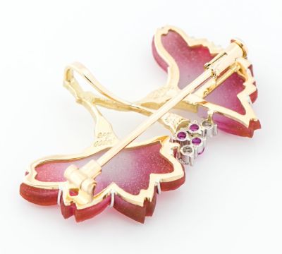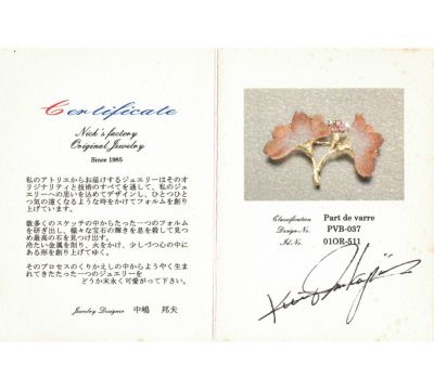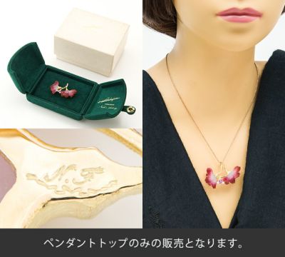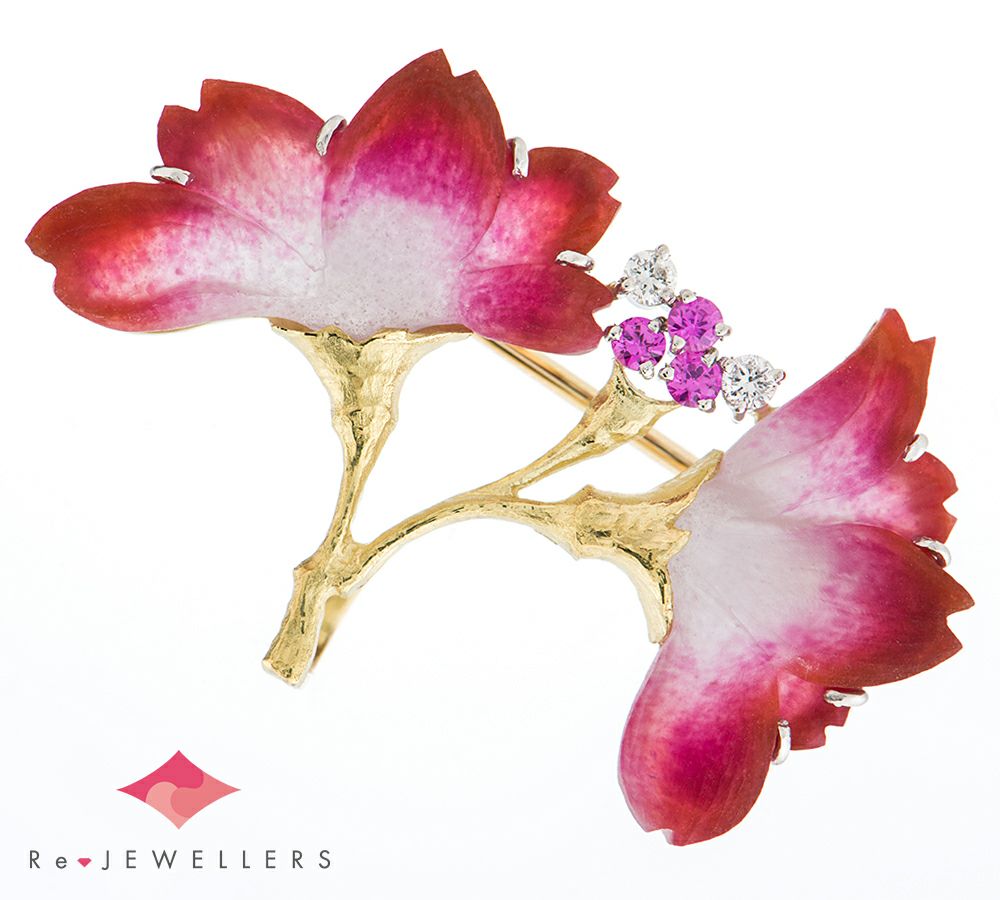 独特の色合いと質感を生み出すガラス工芸技法、パート・ド・ヴェールという技術を取り入れたニックスファクトリーのブローチ兼ペンダントトップ。すりガラスのようにマットな質感と、濃い赤から白色への繊細なグラデーションが美しい2輪の花。その可憐ながらも生命力を感じる佇まいに、魅了されます。ピンクサファイアの鮮やかな煌めきと、艶消しイエローゴールドの上品な艶がデザインのポイントに。素晴らしい加工技術と豊かな色彩感覚でつくり上げた、芸術的なジュエリーです。