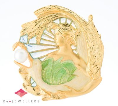 特徴 スペインのジュエリーブランドMASRIERA(マリエラ)社のブローチ。マリエラ社のジュエリーは、マリエラ七宝という半透明の七宝技術を用いて、ほぼすべてハンドメイドで製作され、その色使いと浮き彫り細工、アールヌーヴォーデザインが特徴です。流れるような金細工で羽を表現した白い鳥。大きく開けた口には、パールがセットされています。マットな質感と透明感のあるプリカジュールを使い分け、芸術的な作品に。唯一無二の技術と感性が光る、独創的なジュエリーです。