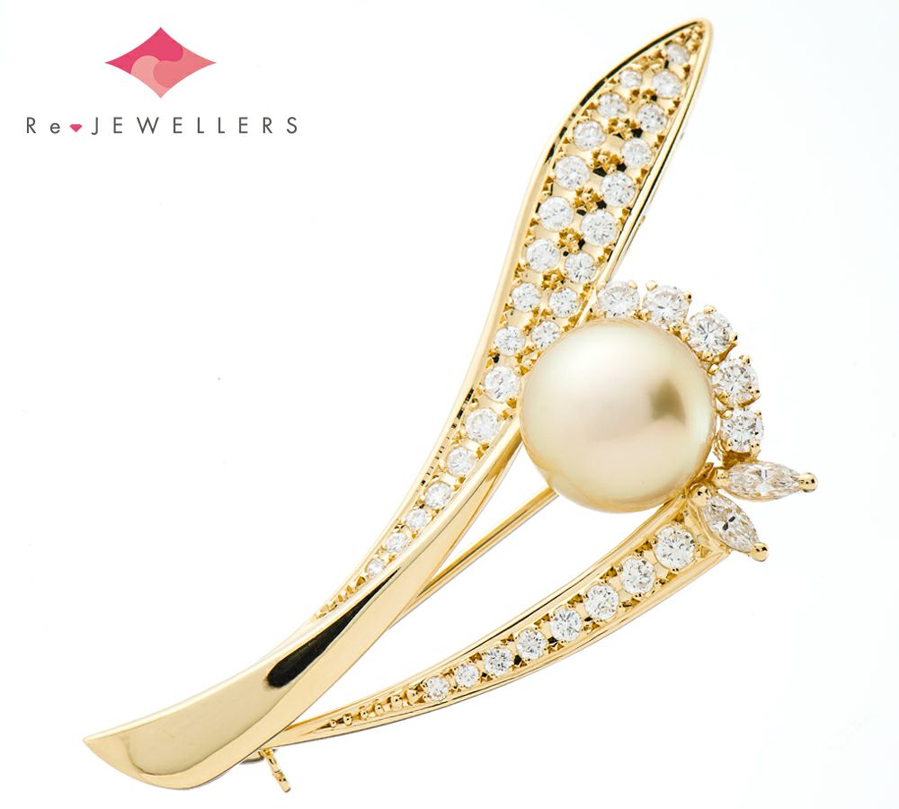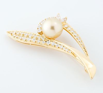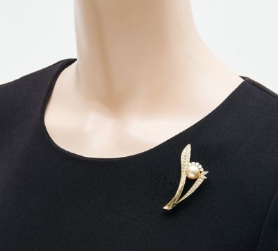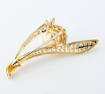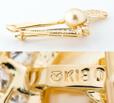 特徴 ゴールデンパールをメインにセットした曲線の美しいミキモトのブローチ。襟元にフィットする縦長なデザイン。抽象的に表現したようなデザインは、2ピースのマーキスが効果的にセッティングされ様々な形に捉えることができ想像が膨らみます。ゴールドとダイヤモンドのバランスも考えられた、ミキモトらしい上品な仕上がり。素材の良さが引き立つエレガントなジュエリーです。