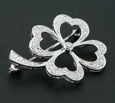 特徴 幸福の象徴であるクローバーをモチーフにしたミキモトのブローチ。クローバーの葉一枚一枚がハートのようにも見えるボリューム感のあるデザインです。太陽の光を浴びた葉が煌めいているかのように、上質なダイヤモンドが眩い輝きを放ちます。年齢を問わず楽しむことのできる、使い勝手の良いジュエリーです。