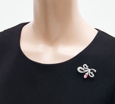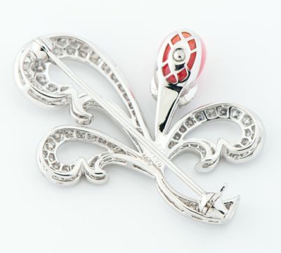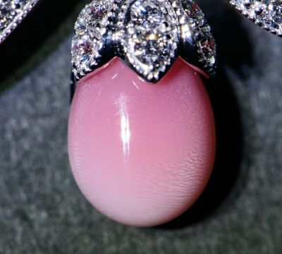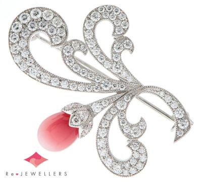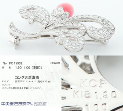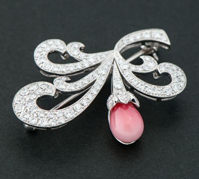 コンクパールのディーラーとしても世界に知られている、カシケイならではの見事な高品質コンクパールをセットしたブローチ。陶器のように美しい艶と、乳白色から濃いピンクカラーへとグラデーションしていく魅惑的な色合い、バランスの取れた丸みのあるフォルムに引き込まれます。得意とする曲線を用いた優美なデザインと、ミル打ち風の装飾の組み合わせで気品溢れる雰囲気に。良質なダイヤモンドの輝きが、素材選びに対する情熱を感じさせる洗練されたハイジュエリーです。
