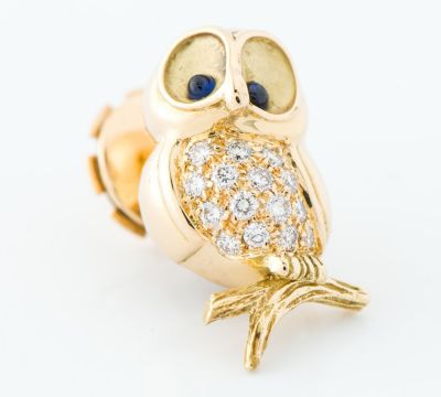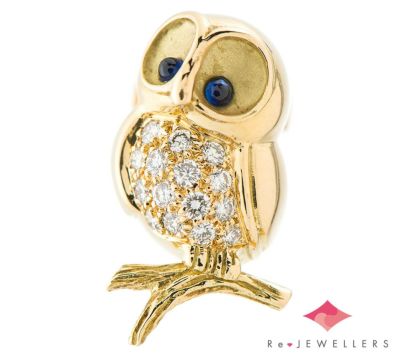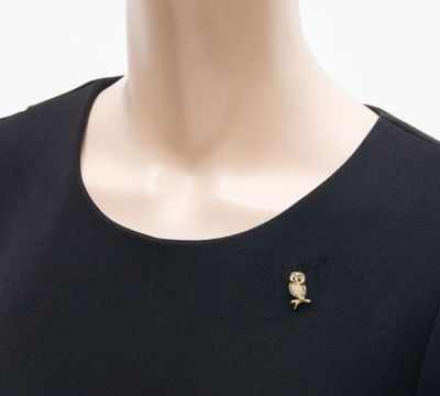 特徴 少し首を傾けた姿が愛らしい、幸福のシンボルフクロウをモチーフにしたブローチ。お腹の部分にはメレダイヤモンドがパヴェセッティングされ存在をアピール、カボションカット ブルーサファイアのつぶらな瞳がとてもキュートです。幹のテクスチャーから細やかで丁寧な仕事ぶりが伝わるチャーミングなジュエリーです。※製造元を示すと思われるロゴ刻印有