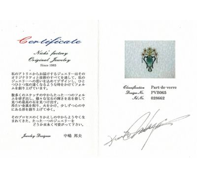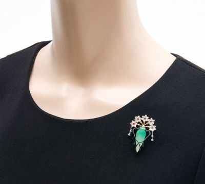 独特の色合いと質感を生み出すガラス工芸技法、パート・ド・ヴェールという技術を取り入れたフラワーベースモチーフのブローチ兼ペンダントトップ。すりガラスのマットな風合いと、グリーンのグラデーションに目を奪われます。黒色の赤銅がデザインのアクセントになっており、生き生きと咲く5輪の花は、中央のピンクサファイアがポイントに。ゆらゆらと揺れるダイヤモンドで動きを出した芸術的ジュエリーです。