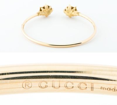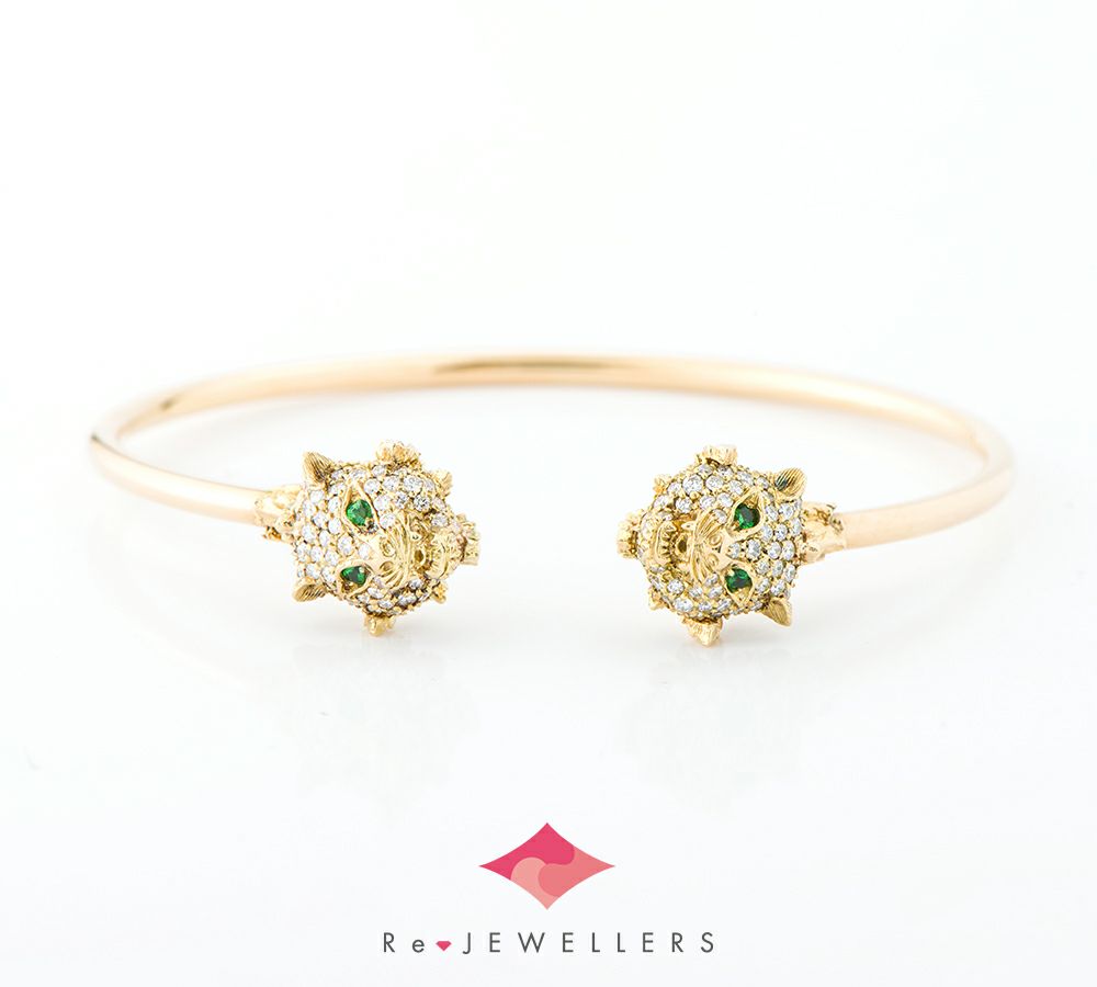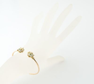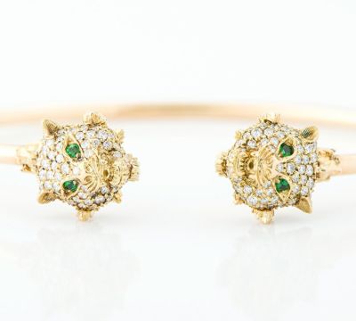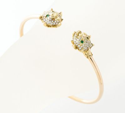 アニマルエンブレムが独創的な魅力を放つグッチのル マルシェ デ メルヴェイユ コレクション。グリーンガーネットの目が光るキャットヘッドが2つ並んだカフブレスレットです。立体的なフォルムに滑らかにパヴェセッティングされたダイヤモンドが、眩い煌めきを放ちます。裏面には繊細な金細工で2枚の葉が表現されており、見えない部分にまでこだわりを感じさせます。力強さを感じる、存在感抜群のジュエリーです。