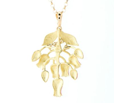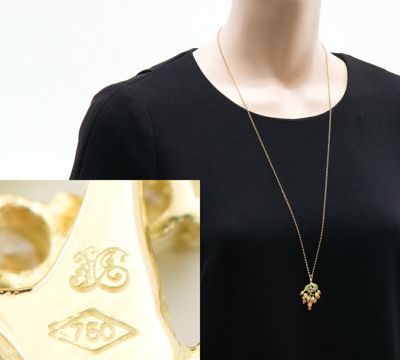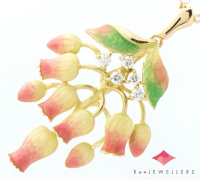 特徴 エマイユ技法を用いて独特の世界観を魅せる中嶋邦夫 ニックスファクトリーのペンダント ネックレス。アセビ(馬酔木)のクリスマス・チアやスプリングベルを思わせる細やかな技法は、地金部分に繊細な彫刻を施し、模様が浮き出るよう釉薬をのせ焼きつける手法です。淡いピンクや若々しいグリーンカラーが柔らかでフェミニンな雰囲気を醸し出します。エマイユの奥深さが伝わる、芸術的なジュエリーです。