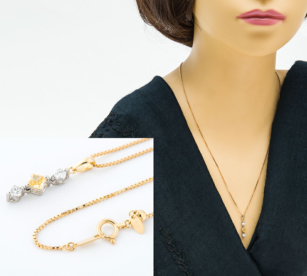 上質なナチュラル(天然)インテンス オレンジイエローダイヤモンドをセットしたペンダント・ネックレスです。クッションカットの濃いオレンジイエローダイヤモンドとゴールドチェーンの統一感と、上下にセットされた2石のダイヤモンドとのコントラストが目をひきます。日常使いができる小ぶりなサイズも嬉しい、洗練された印象を与える美しいジュエリーです。
