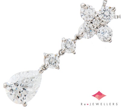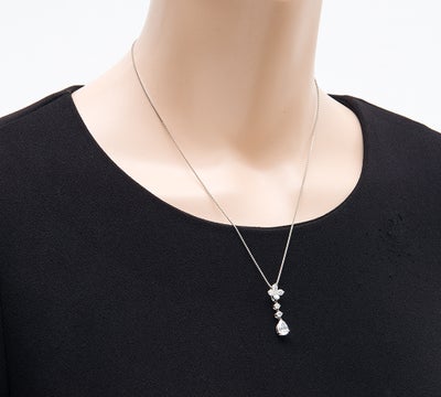 1ctアップのペアシェイプダイヤモンドをメインにセットしたペンダント・ネックレスです。メインのペアシェイプは、ふっくらとした形状で可愛らしい印象を与えます。上部にセットされたラウンドブリリアントカットのダイヤモンドがペアシェイプの輝きを引き立てています。品質の良い石を縦長にセットし、上品に仕上げられたエレガントなジュエリーです。
