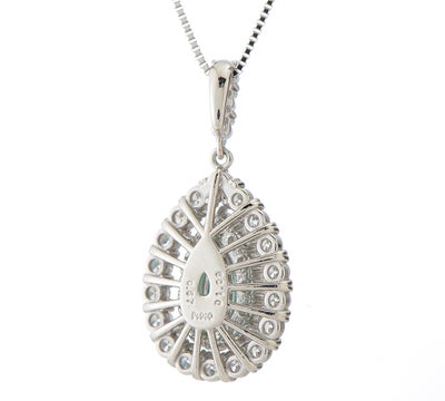 僅かにブルーを帯びたグリーンカラーが特徴的な、稀少なブラジル産パライバトルマリン0.57ctをセットしたペンダント・ネックレスです。透明感のある煌めきと、ペアシェイプカットの持つ凛とした佇まいを引き立てるダイヤモンドの装飾が、エレガント。二重の取り巻きの間に少し空間を持たせることで、形がより強調されその美しさが引き立ちます。人気の高いパライバトルマリンを楽しむことのできる、気品溢れるジュエリーです。