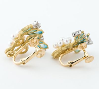 特徴 エマイユ技法を用いて独特の世界観を魅せる中嶋邦夫のニックスファクトリー。こぼれんばかりにたわわになった木の実を表現した艶やかな真珠と、葉に施されたエマイユの柔らかなグラデーションが調和したイヤリング。絵画を想わせる繊細な色遣いに、存在感を放つ上品な艶消しゴールドの輝きと、光を浴びた朝露のような眩いダイヤモンドが華を添えます。末永く楽しんでいただける、飽きの来ないエレガントで芸術的なジュエリーです。
