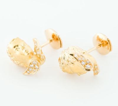 特徴 カレライカレラは、1885年にスペインのマドリードのサンタイザベル通りで創業されたスペイン王室御用達の高級ジュエリーブランド。繊細な金細工とテクスチャーに工夫を凝らしたピアスは、門外不出と言われたマットゴールド技法により肌の質感を見事に表現。向かい合う天使の横顔と、羽にセットされたダイヤモンドの輝きが目を引きます。