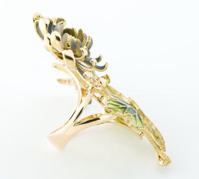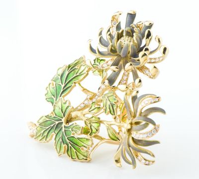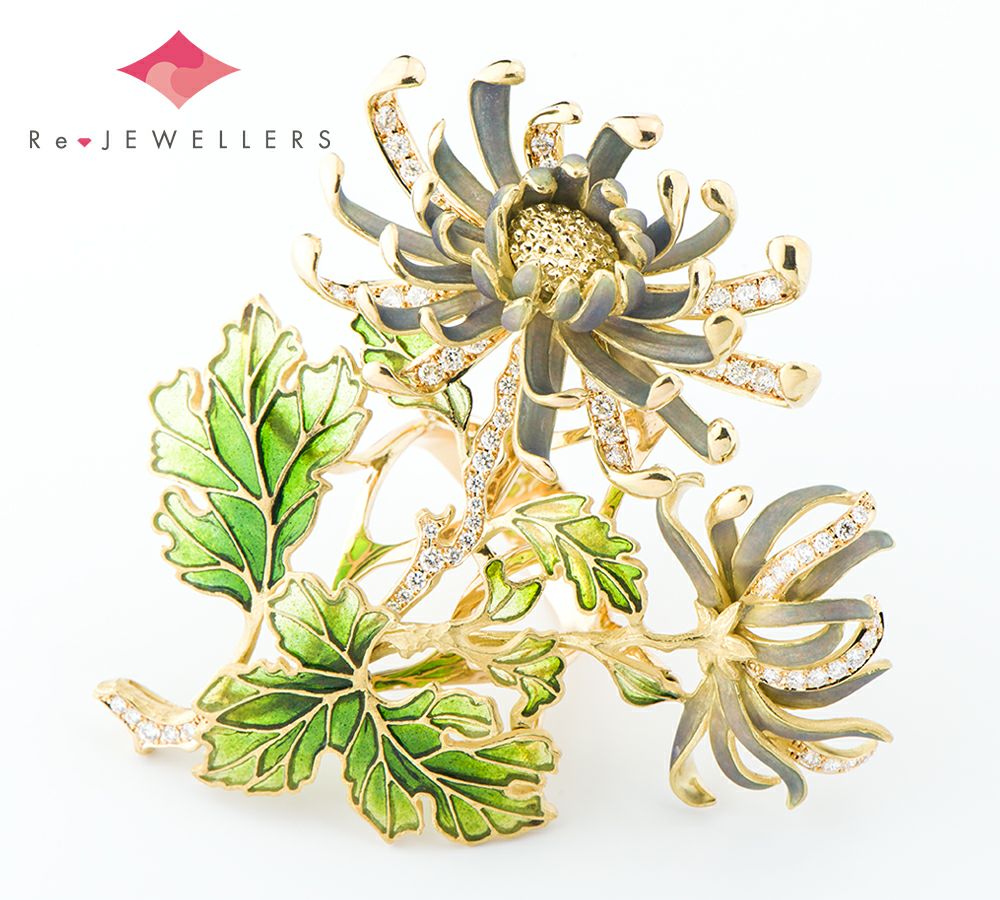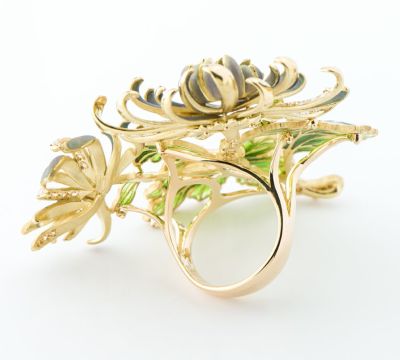 特徴 エマイユ技法を用いて独特の世界観を魅せる中嶋邦夫のニックスファクトリー。無数にある菊のバリエーションから、グレイッシュでシックな色合いをセレクトするところに、デザイナー独自の感性が光る大振りなリング。花びら一つ一つの生命力を感じさせる立体感のある丁寧な仕立てと、艶やかなグリーンのグラデーションのエナメルの葉はキャンバス一杯に描かれた絵画のように伸びやかな構図が目を引きます。指通りもしなやかなつくりにため息がこぼれます。年齢を重ねてもなお、個性豊かに咲き誇る人々に向けたメッセージでしょうか。様々な想像を掻き立てる、大振りで芸術的なジュエリーです。