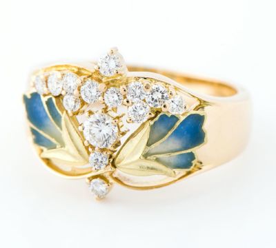 特徴 エマイユ技法を用いて独特の世界観を魅せる中嶋邦夫のニックスファクトリーのリング。ティアラのようなデザインは、サイズの異なるダイヤモンドが絶妙なバランスでアレンジメントされており、質感の異なるエナメルのトルコキキョウが瑞々しく際立たせます。0.3mm前後の線で模様を描く高度な技術と、美しい色彩を生み出すために幾度となく手を加えて創りだされる技法によって生まれた、装いに華やぎを添えるエレガントなジュエリーです。