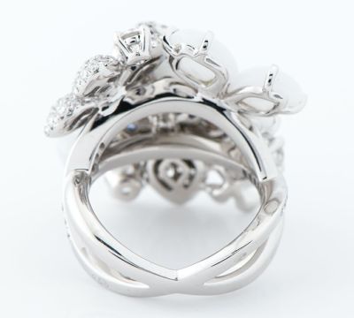 ショーメと縁の深いナポレオンの皇后ジョゼフィーヌが愛した庭園に植えられたことから、フランス語でアジサイを意味するオルタンシアをモチーフに作られたコレクション。艶やかなホワイトカルセドニーと、ダイヤモンドの質感の違いを組み合わせて表現された花々は、眩い煌めきが華やかな印象。ランダムにセットされた3石の良質なダイヤモンドや、花芯にセットされたマーキスシェイプのブルーサファイア、一輪一輪が美しく見える重なり具合など、全てにこだわりが詰まった素晴らしいデザインは、ただただ美しいの一言に尽きます。ショーメらしい独創性を感じさせる上品なハイジュエリーです。