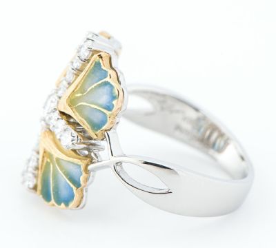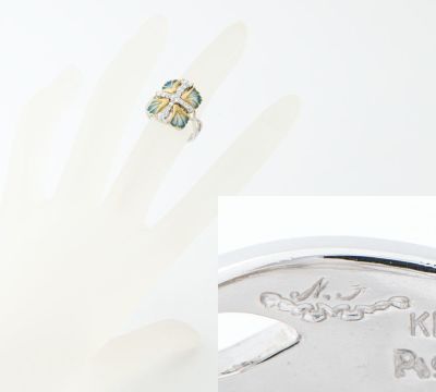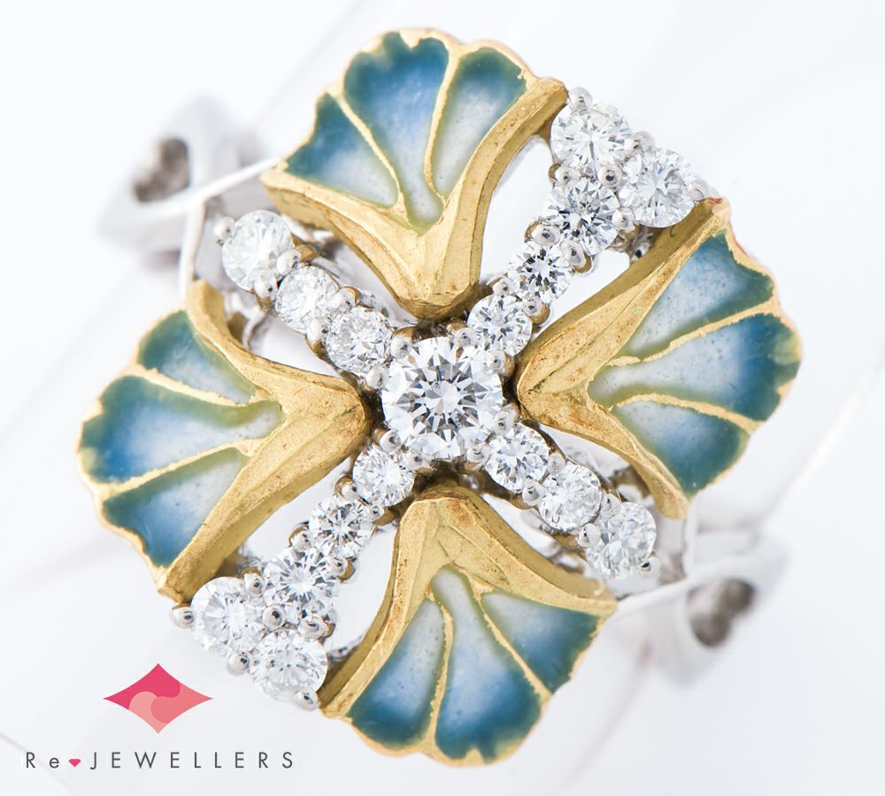 特徴 エマイユ技法を用いて独特の世界観を魅せる中嶋邦夫のニックスファクトリーのリング。サイズの異なるダイヤモンドを中心から十字にセット。質感の異なるエナメルのトルコキキョウを間にはめ込み各々を惹き立てるようなデザイン。0.3mm前後の線で模様を描く高度な技術と、美しい色彩を生み出すために幾度となく手を加えて創りだされる技法によって生まれた、装いに華やぎを添えるエレガントなジュエリーです。