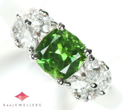 深い黄緑色に鮮やかな色合いが目を引く、デマントイドガーネット0.79ctのリング。ロシアやヨーロッパでは幸運の象徴とされたインクルージョン、ホーステールをルーペで確認することができます。存在感を放つ個性的なクッションシェイプにマーキスブリリアントダイヤモンドをあしらい、エレガントに仕上げています。あらゆるシーンで楽しむことのできる、華やかで魅力的なジュエリーです。