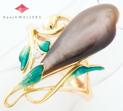 特徴 エマイユ技法を用いて独特の世界観を魅せる中嶋邦夫のニックスファクトリー。地金部分に繊細な彫金模様を施し、模様が浮き出るよう釉薬を載せて焼き付ける技法で鮮やかなグリーンの葉を表現しています。つぼみの黒百合を黒蝶貝の光沢を効果的に使し表現。動くたびに美しく艶めきます。朝露のように煌めく1石のダイヤモンド、伸びやかな美しいデザインからも瑞々しさが伝わります。初期にデザインされた作品で、素朴なモチーフを芸術的に仕上げた個性的なジュエリーです。